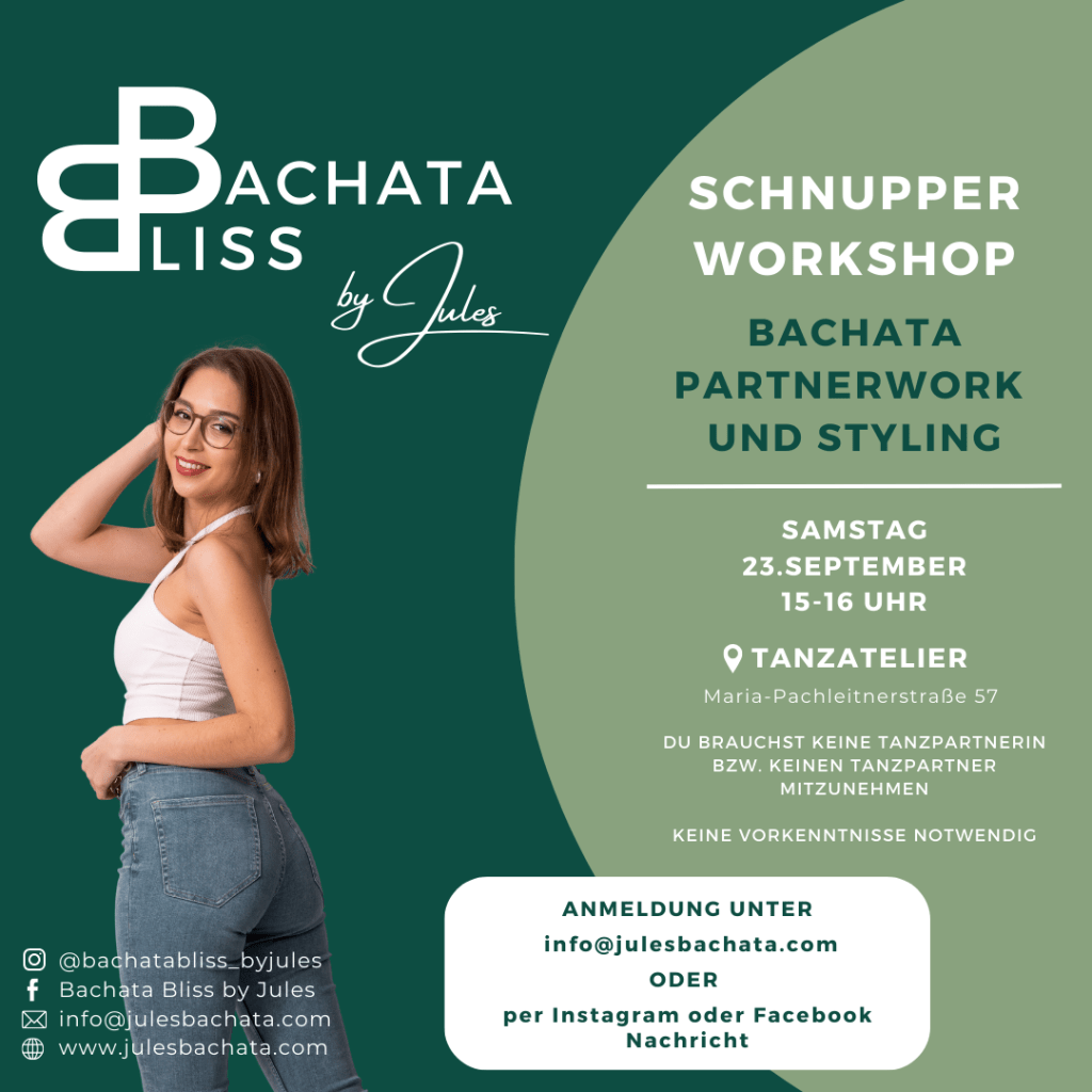 Du bist dir nicht sicher, ob Bachata das Richtige für dich ist? Melde dich jetzt für den kostenlosen SCHNUPPERWORKSHOP am Samstag, 23. September, an!